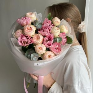 Яркий весенний букет девушке из кустовых хризантем с желтыми тюльпанами