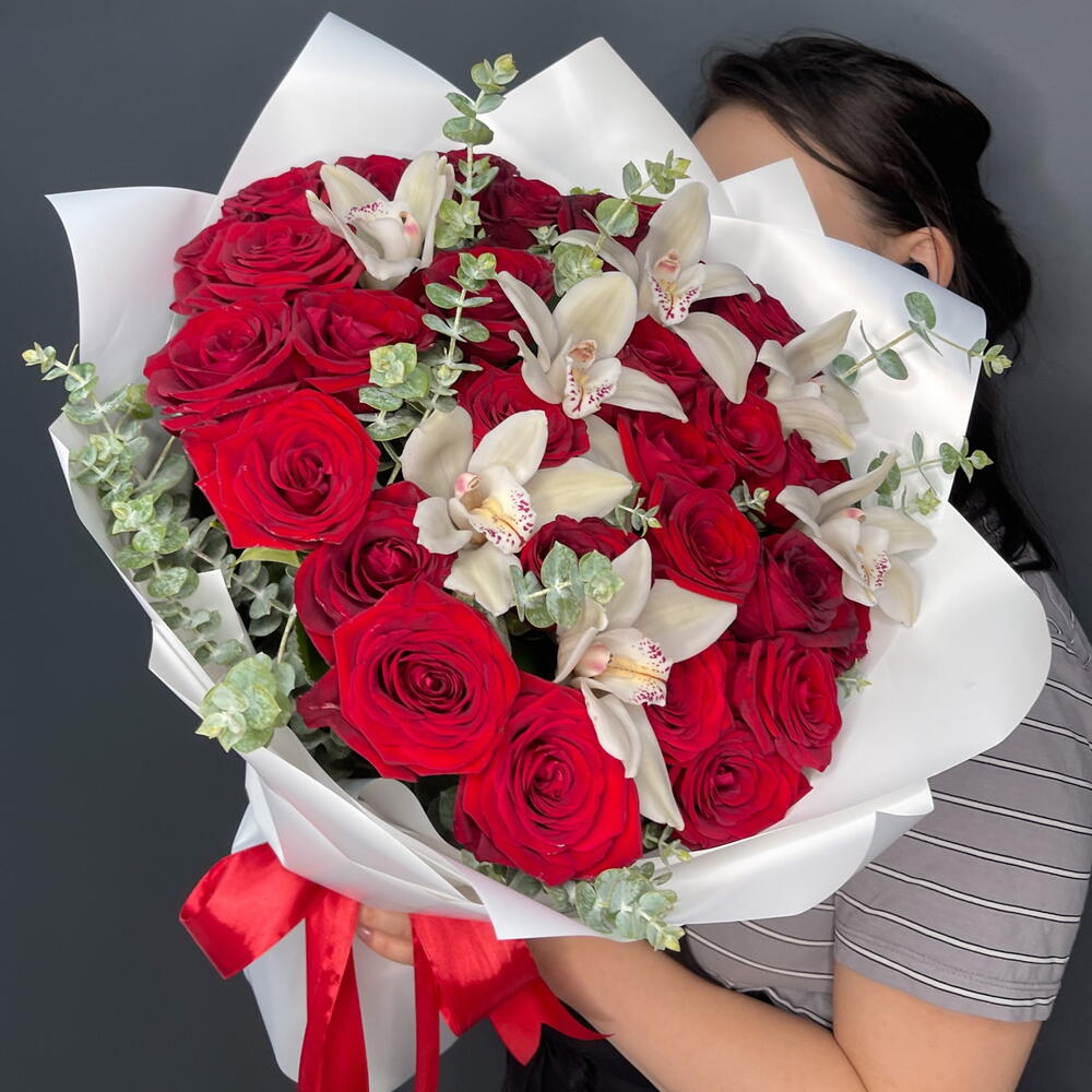 Роскошный букет из алых роз и белых орхидей с ароматным эвкалиптом в стильной дизайнерской упаковке